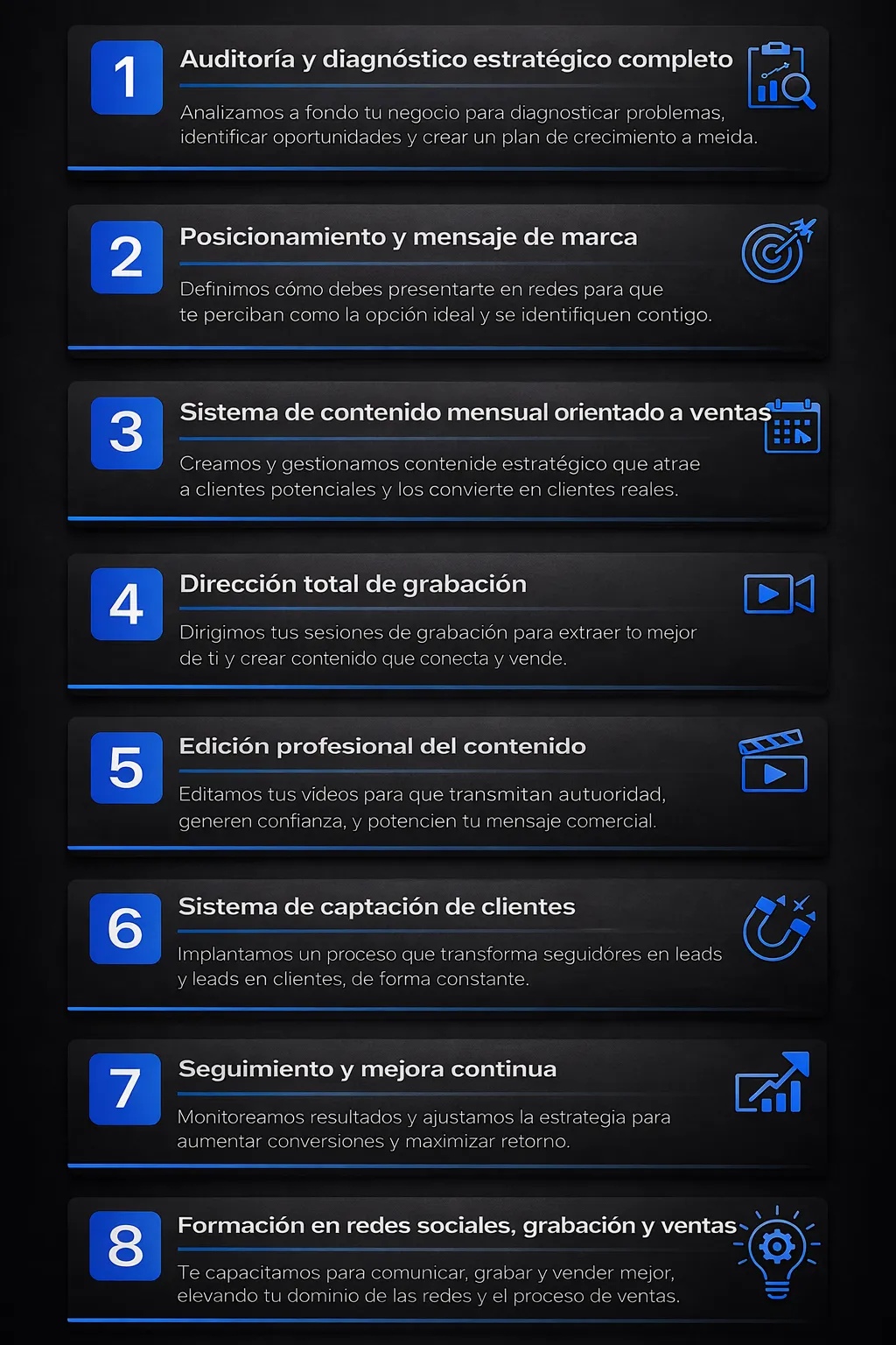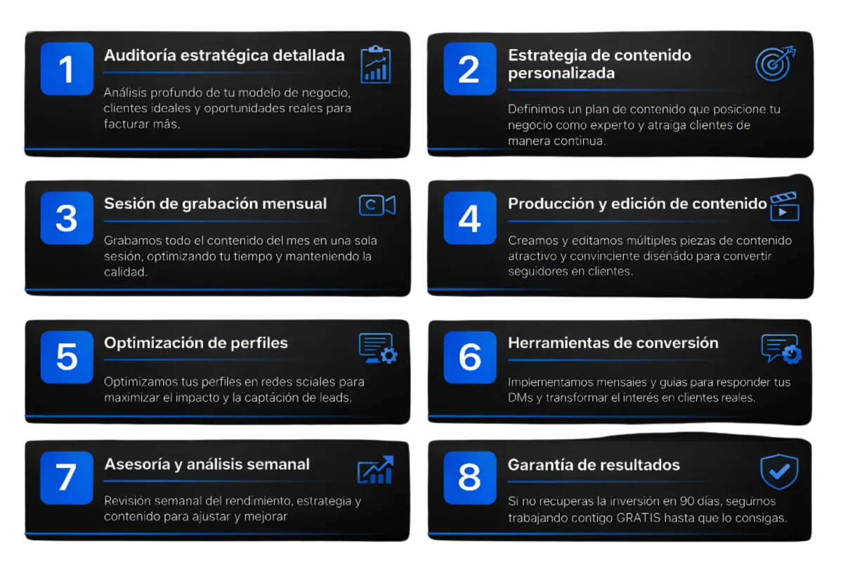 Estrategia, contenido, estructura de ventas y optimización continua. Todo conectado.